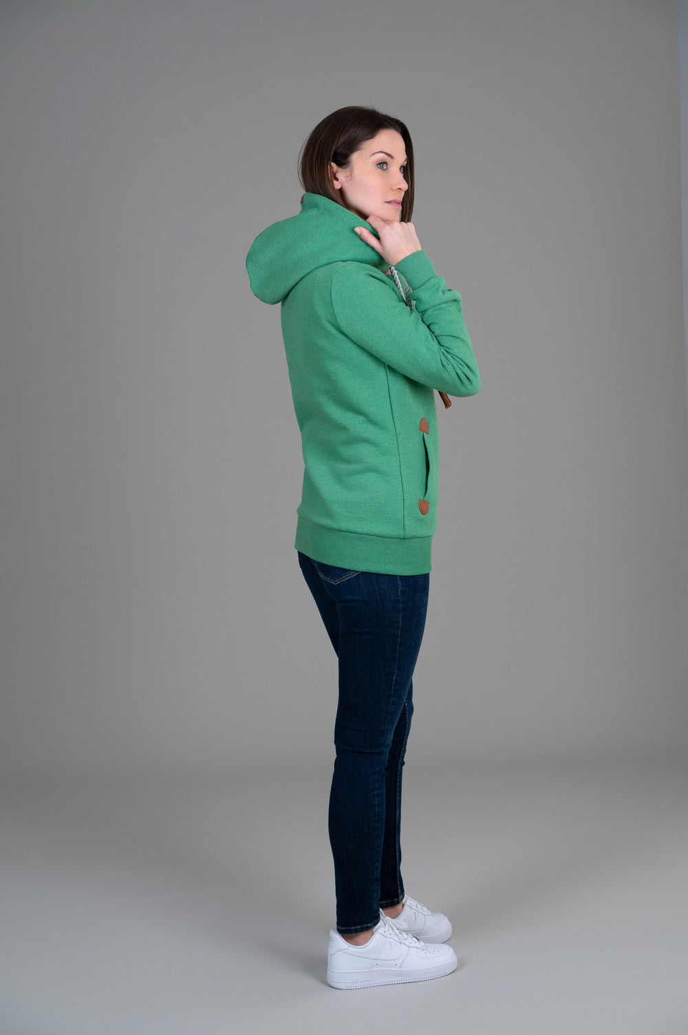 • Hood with adjustable rope drawstrings and vegan leather caps