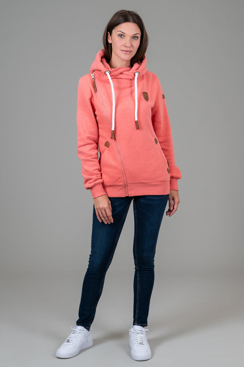 • Hood with adjustable rope drawstrings and vegan leather caps