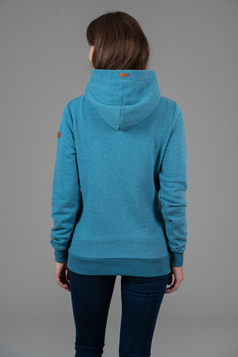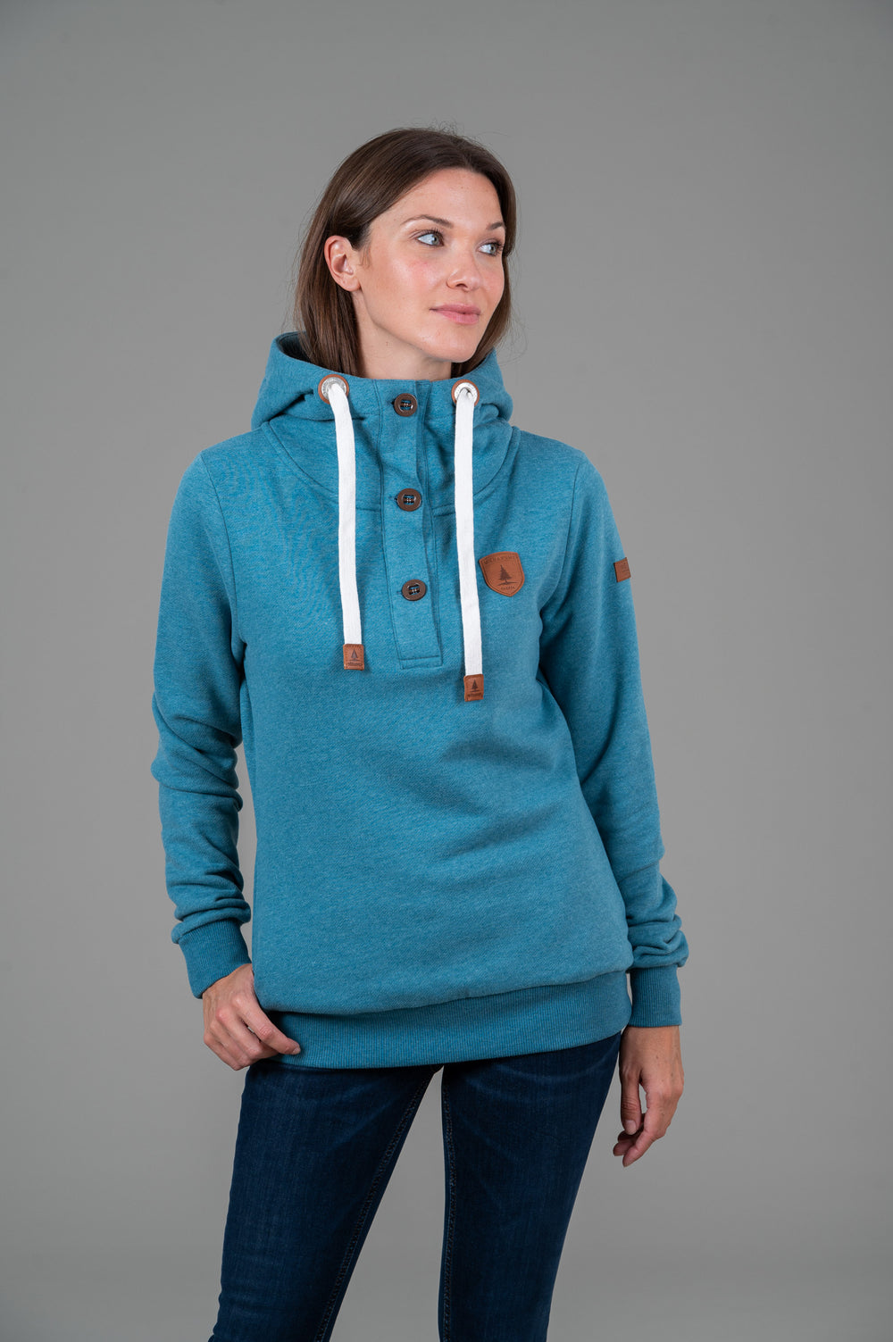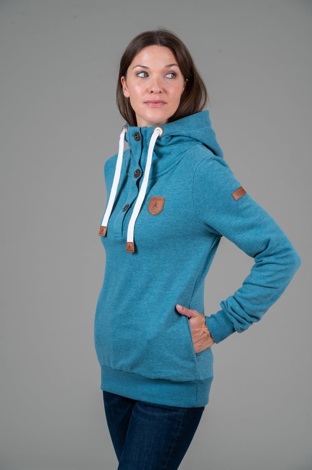 • Hood with adjustable flat woven rope drawstrings and vegan leather caps