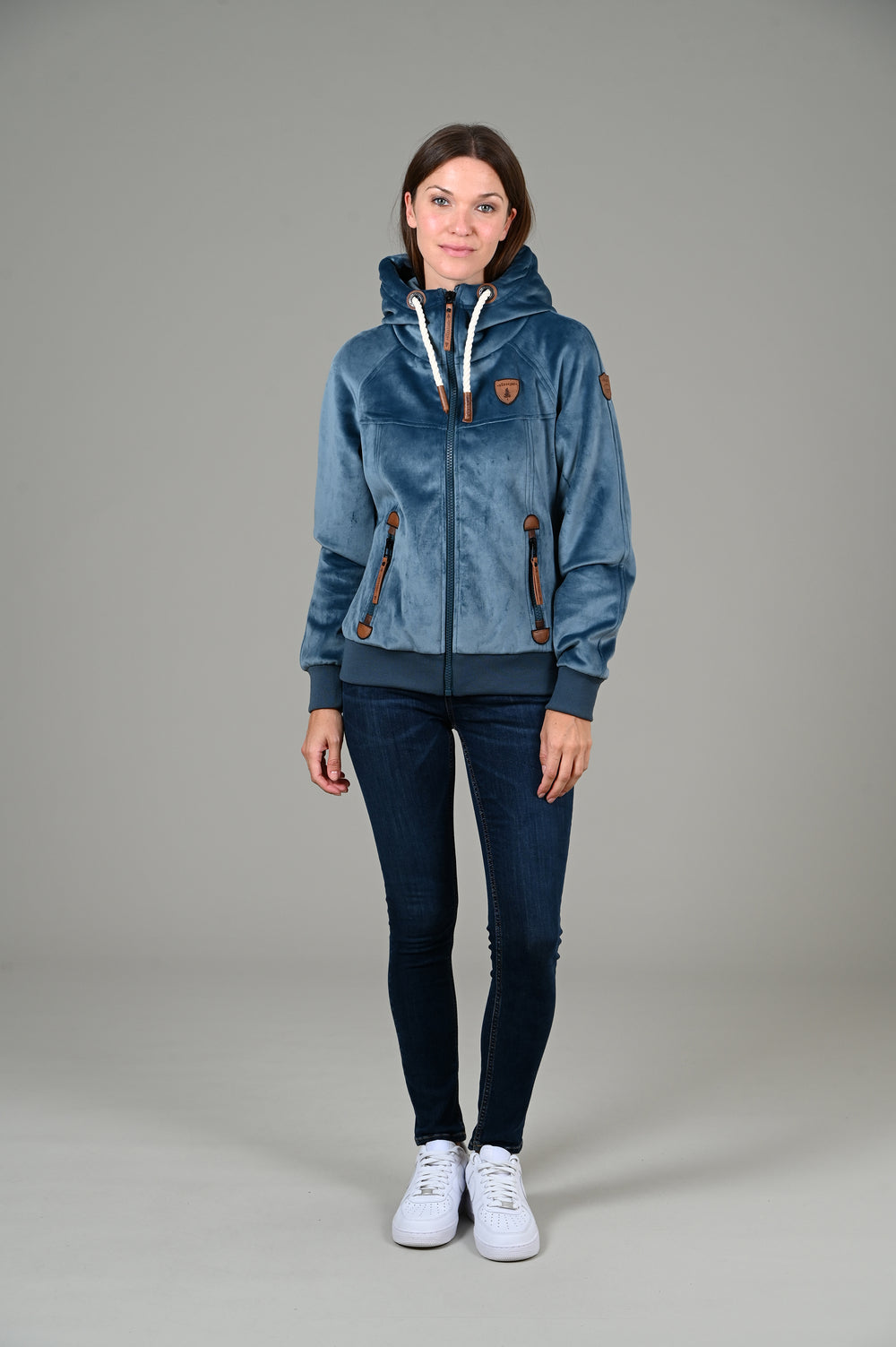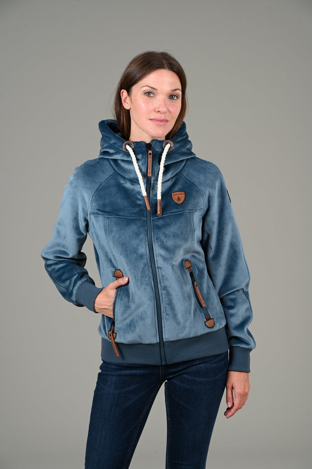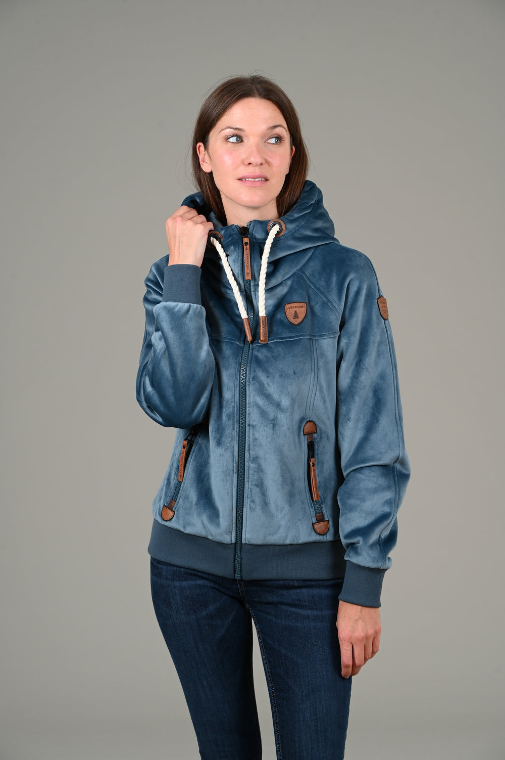 • Hood with adjustable rope drawstrings and vegan leather caps