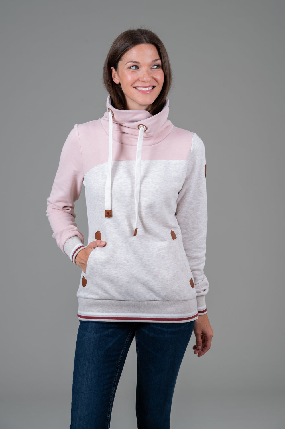 • Cowl neck with adjustable rope drawstrings and vegan leather accents