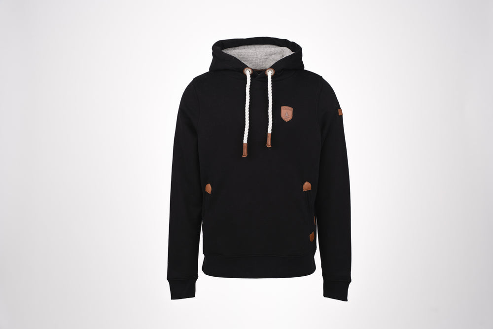 • Hood with adjustable rope drawstrings and vegan leather caps