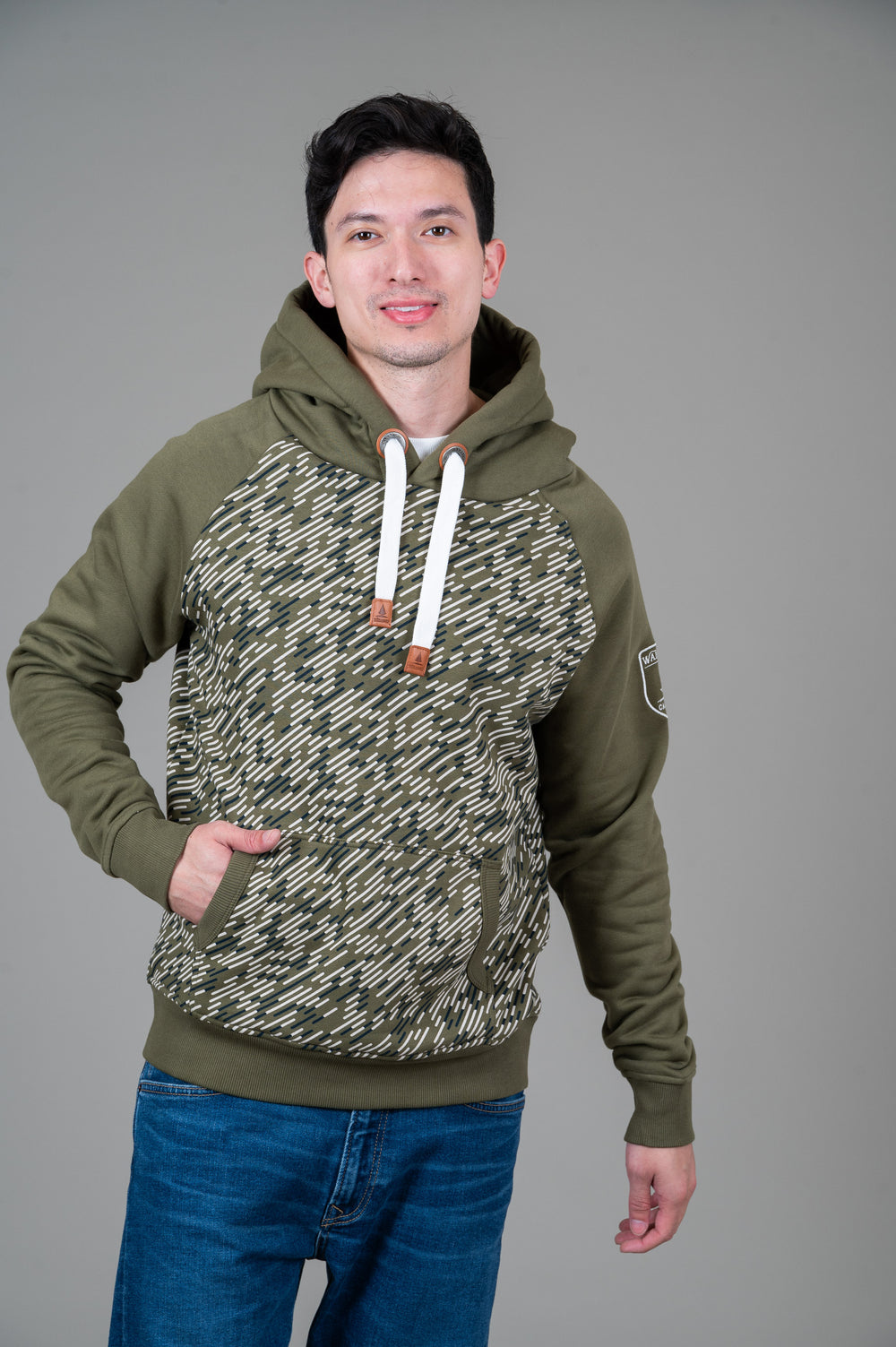 • Hood with adjustable rope drawstrings and vegan leather caps