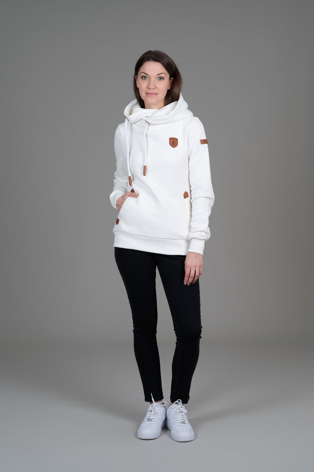 • Hood with adjustable rope drawstrings and vegan leather caps