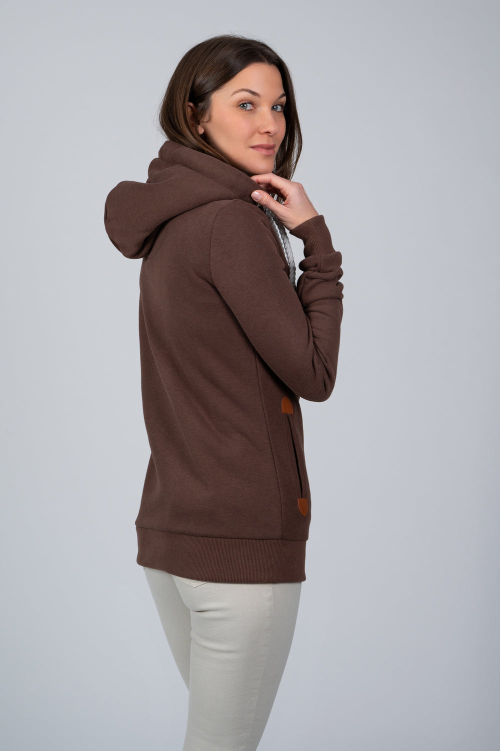 • Hood with adjustable rope drawstrings and vegan leather caps