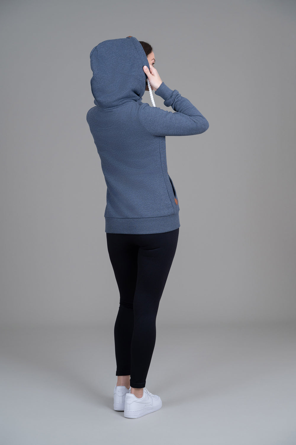 • Hood with adjustable rope drawstrings and vegan leather caps