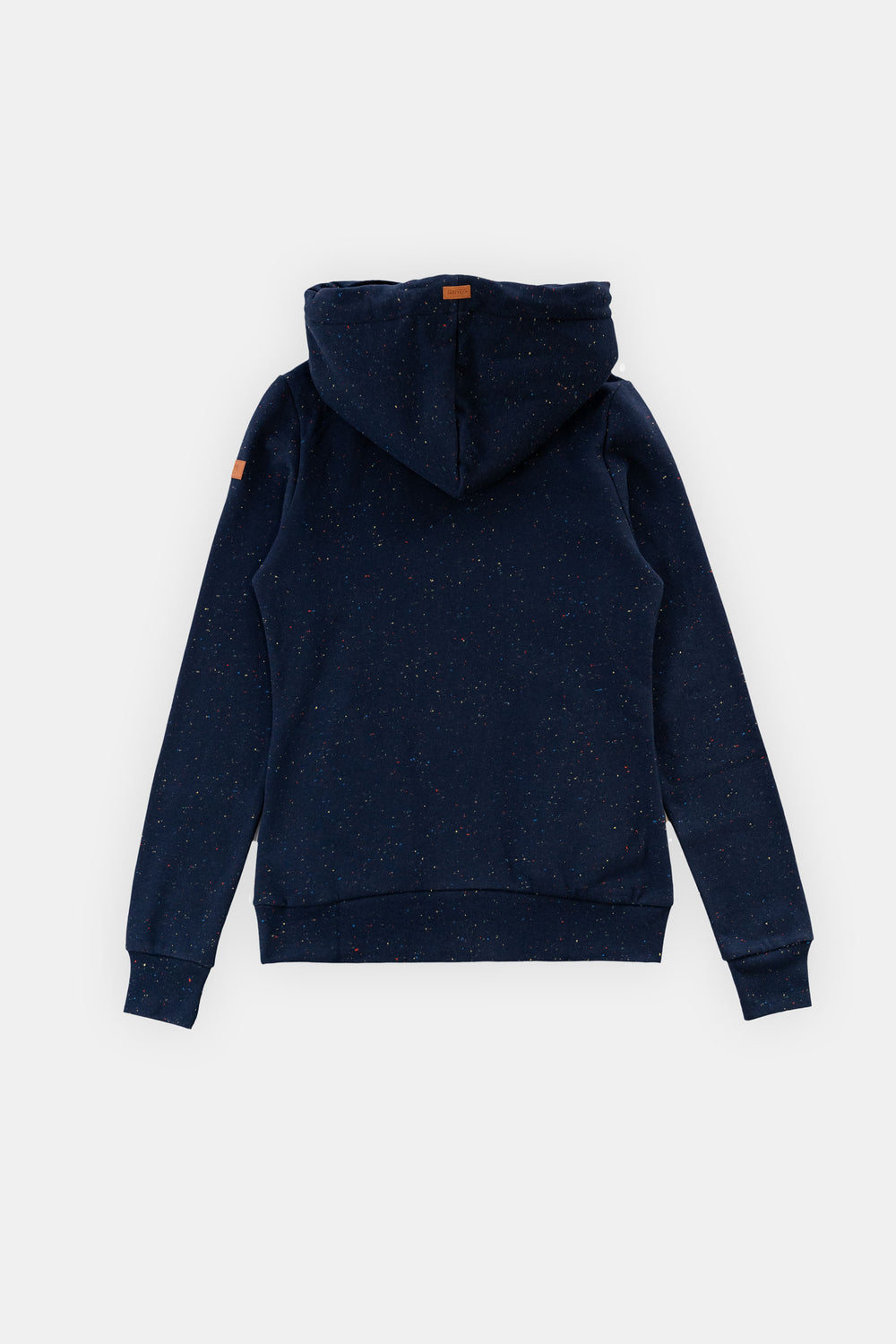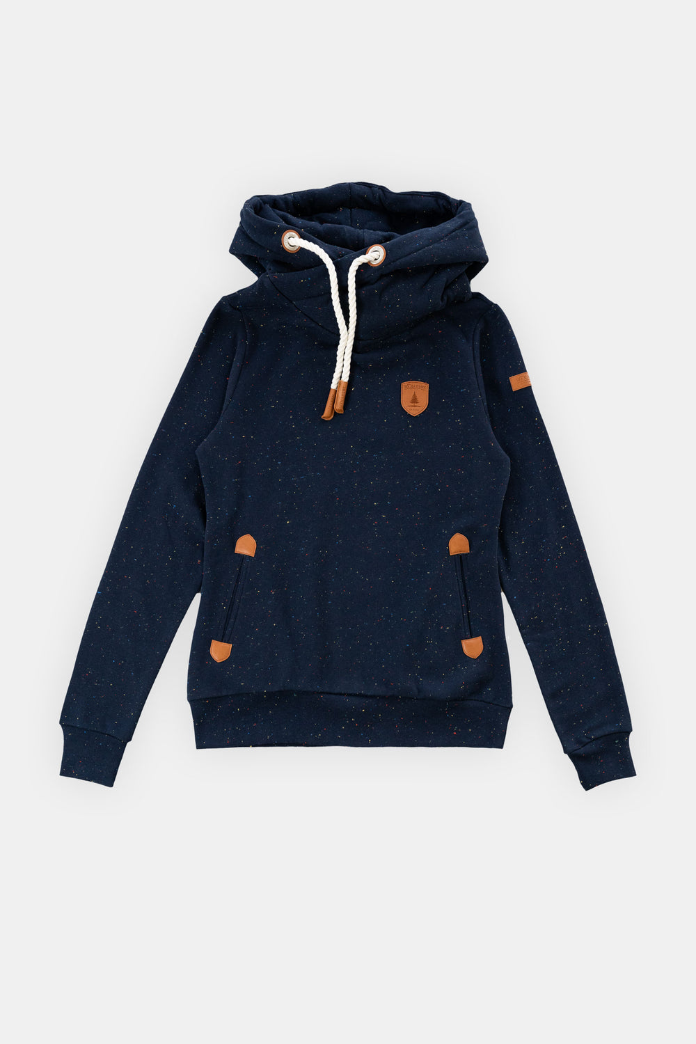 • Cowl neck hood with adjustable rope drawstrings and vegan leather caps