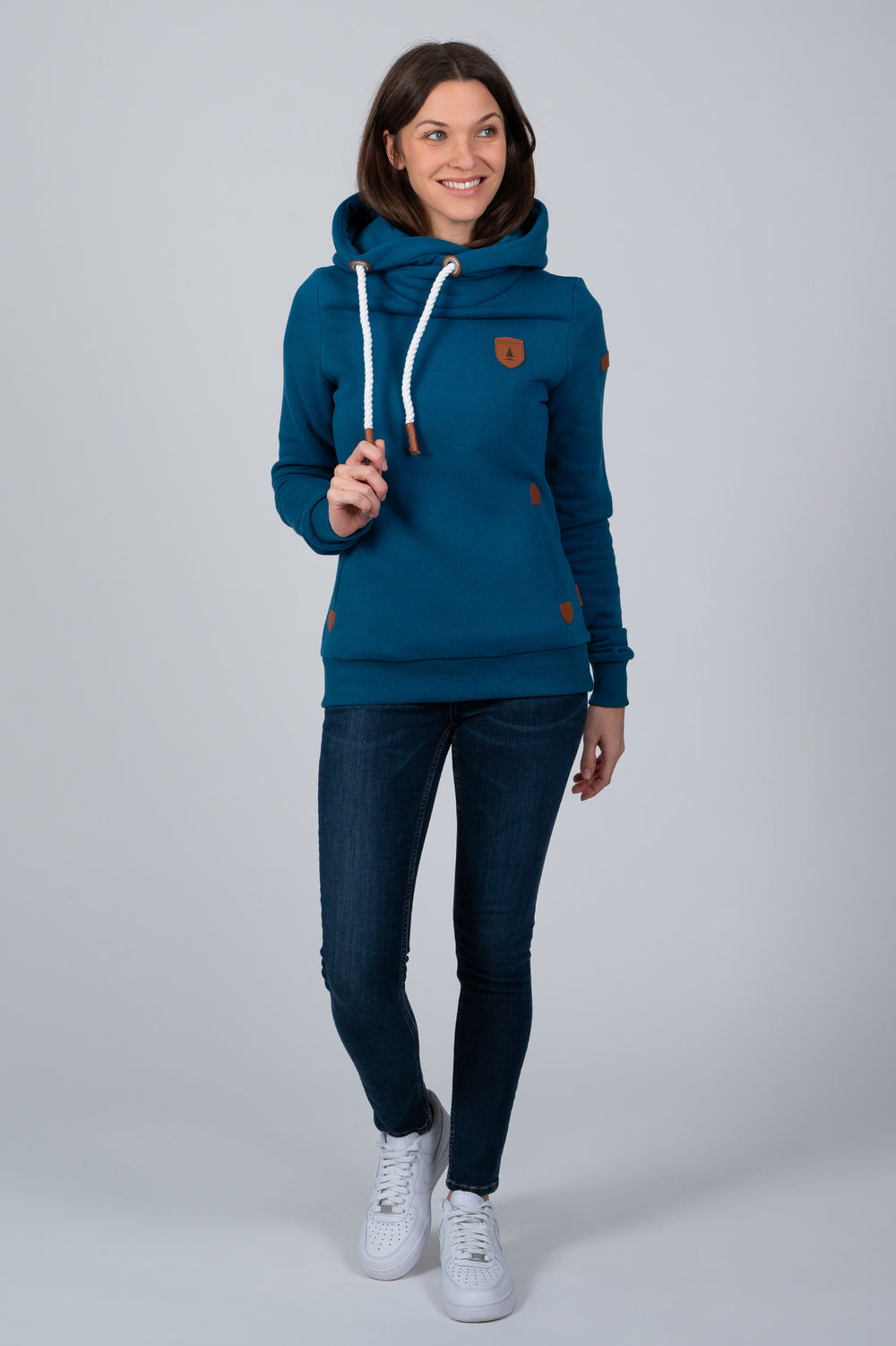 • Hood with adjustable rope drawstrings and vegan leather caps