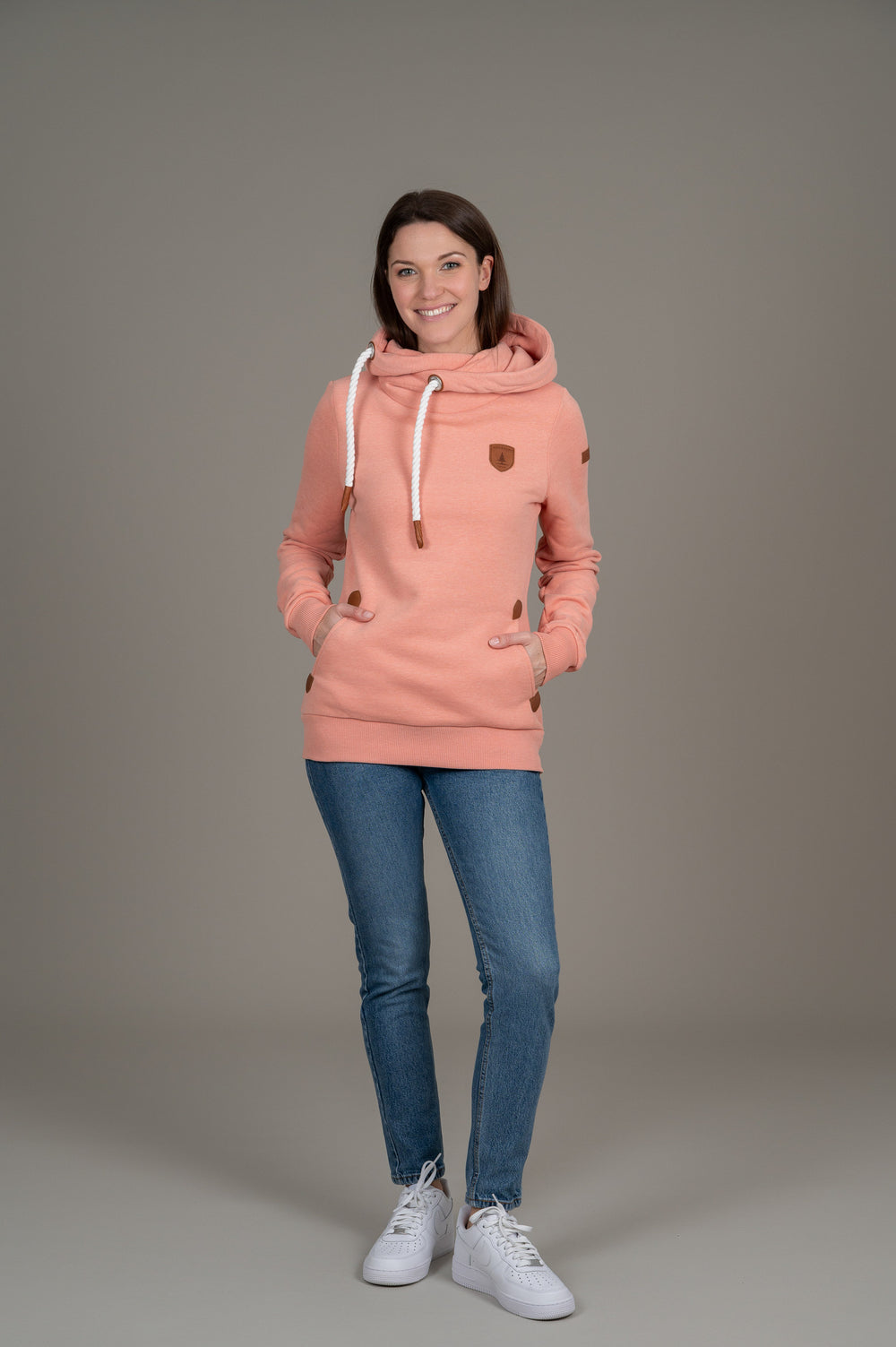 • Hood with adjustable rope drawstrings and vegan leather caps