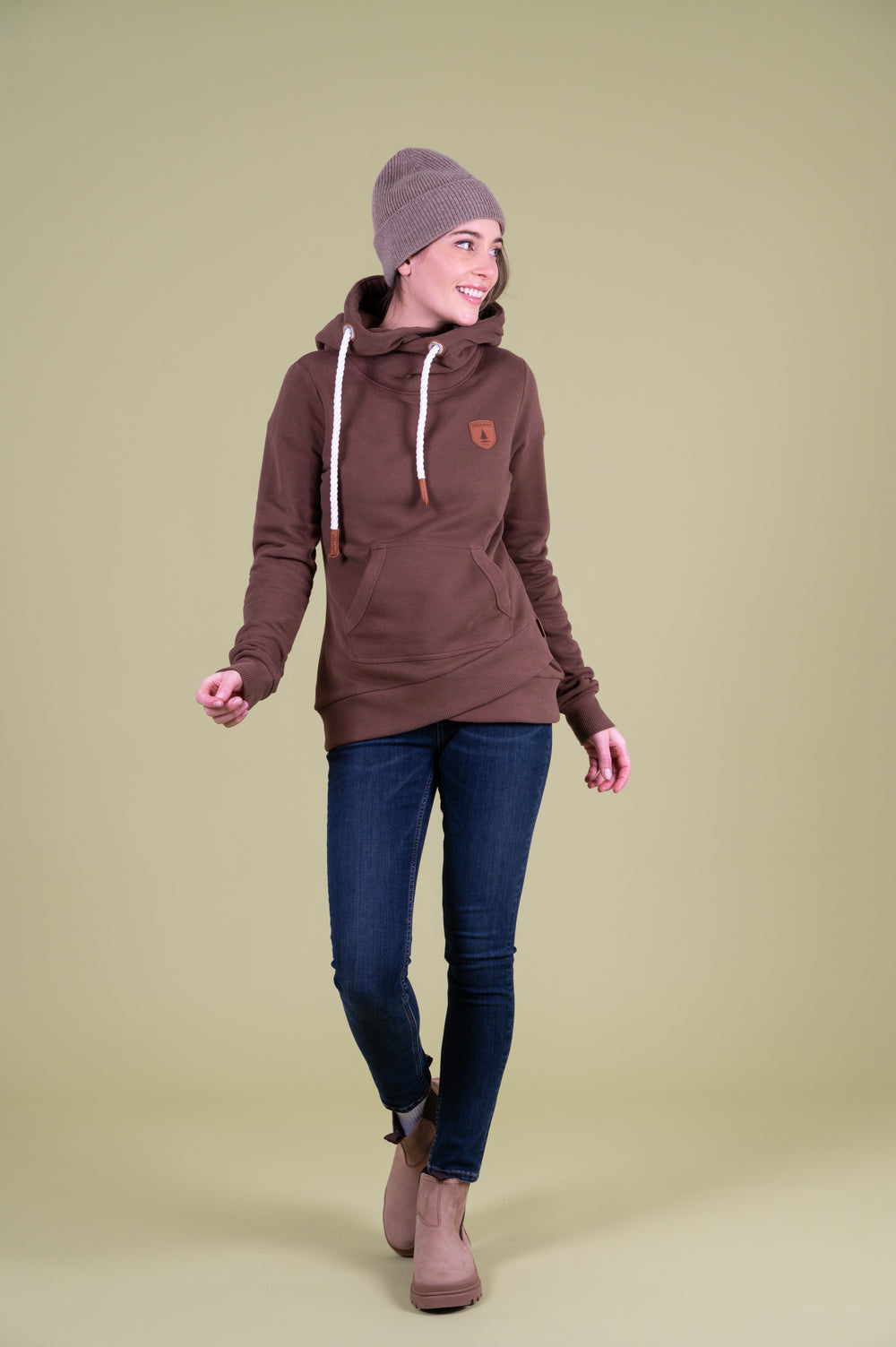 • Cozy cowl neck with rope drawstrings and vegan leather accents