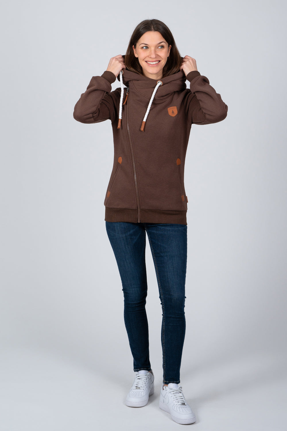 • Hood with adjustable rope drawstrings and vegan leather caps