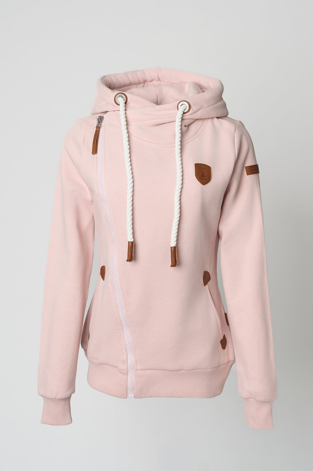 • Hood with adjustable rope drawstrings and vegan leather caps