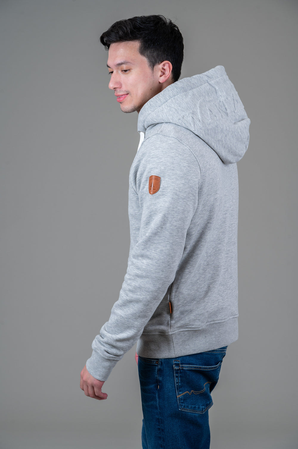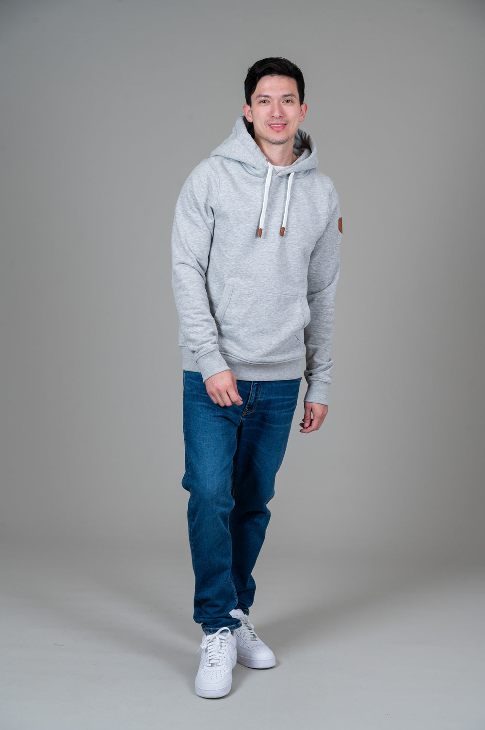 • Hood with adjustable flat drawstrings and vegan leather caps