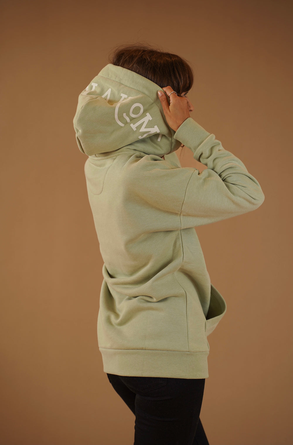 • Thick hood with adjustable flat woven rope drawstrings and vegan leather caps