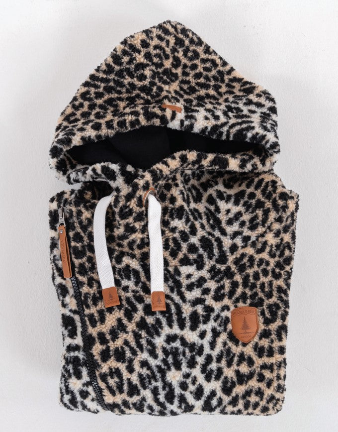 • Cowl neck hood with adjustable flat woven rope drawstrings and vegan leather caps