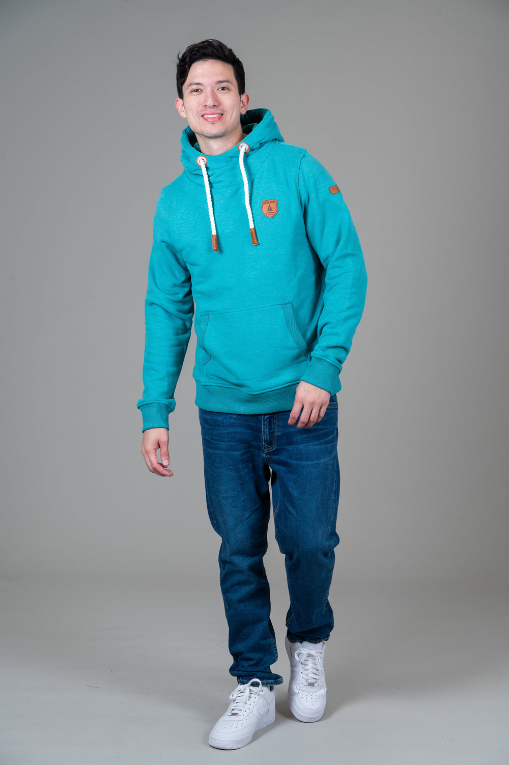 • Hood with adjustable rope drawstrings and vegan leather caps