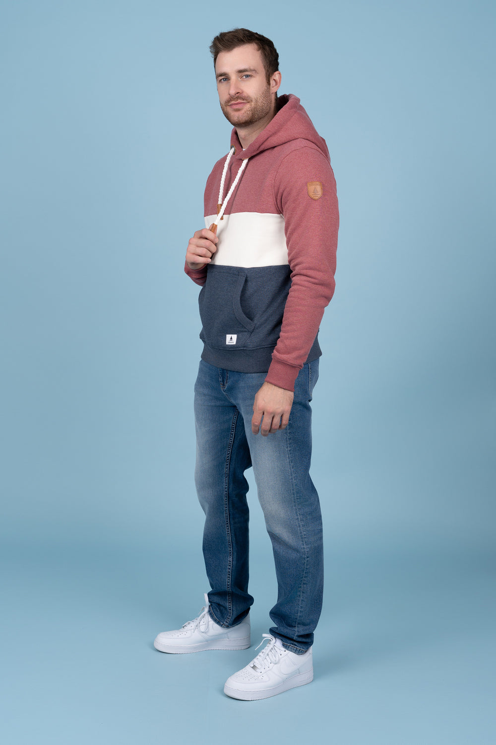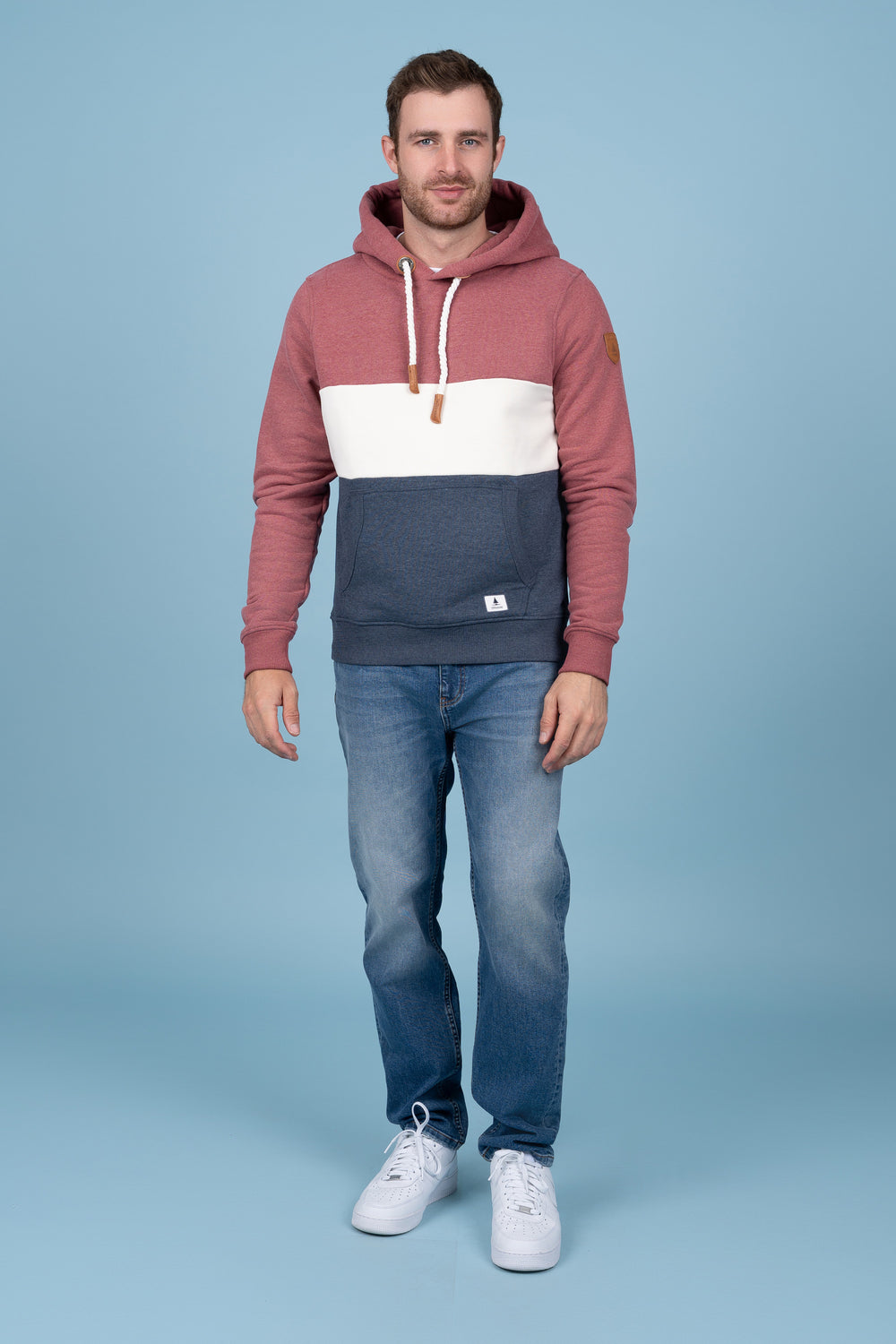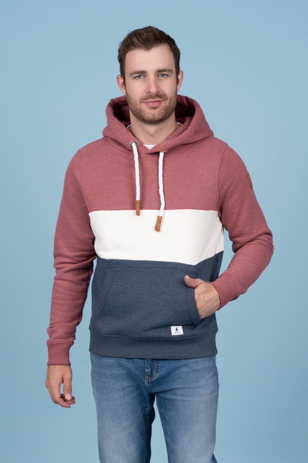 Men's Color-Blocked Pullover Terry Hoodie with Kangaroo Pocket in Berry/Oatmeal/Navy