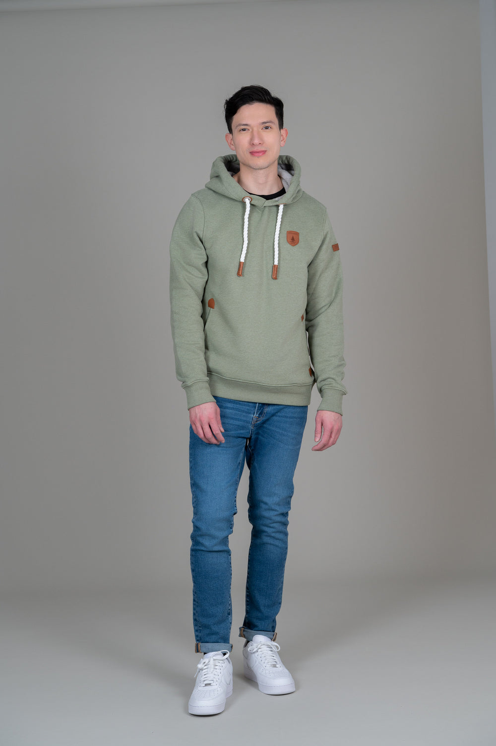 • Hood with adjustable rope drawstrings and vegan leather caps