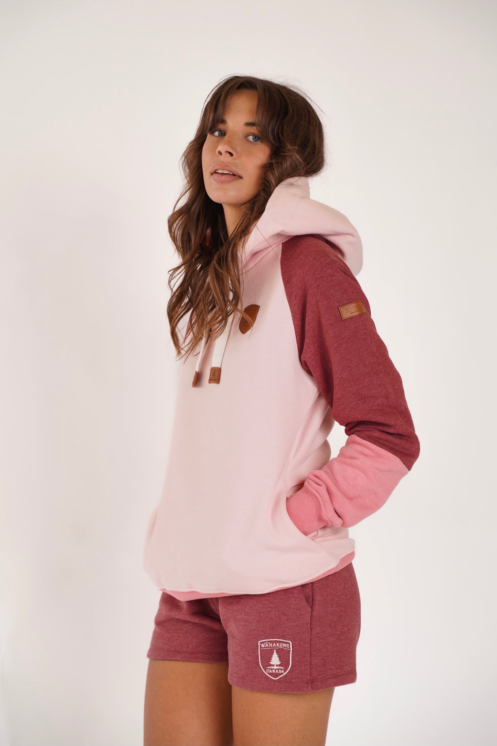 Hood with adjustable flat woven ribbon drawstrings and vegan leather caps