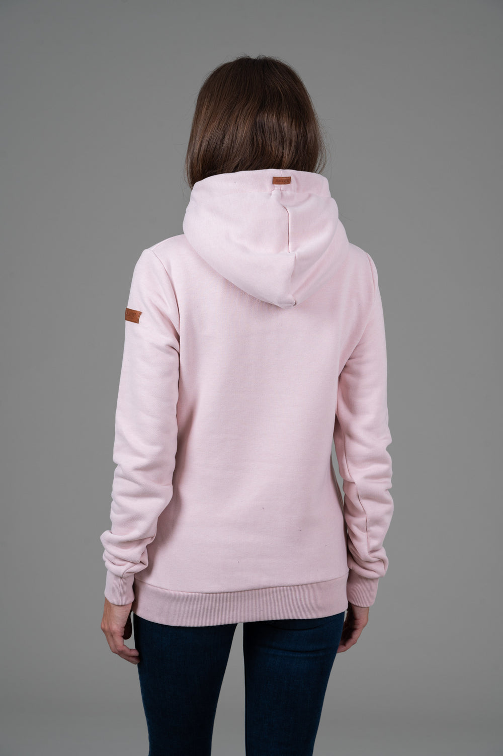 • Hood with adjustable flat woven rope drawstrings and vegan leather caps