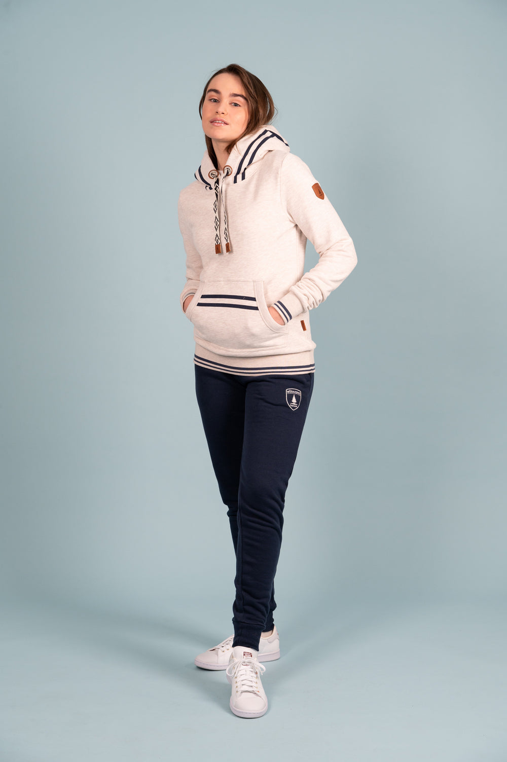 • Striped hood with adjustable flat drawstrings and vegan leather caps