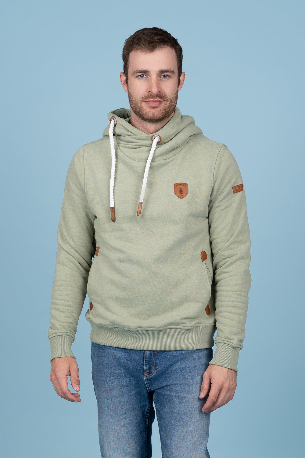 • Hooded cowl neck with adjustable rope drawstrings and vegan leather caps
