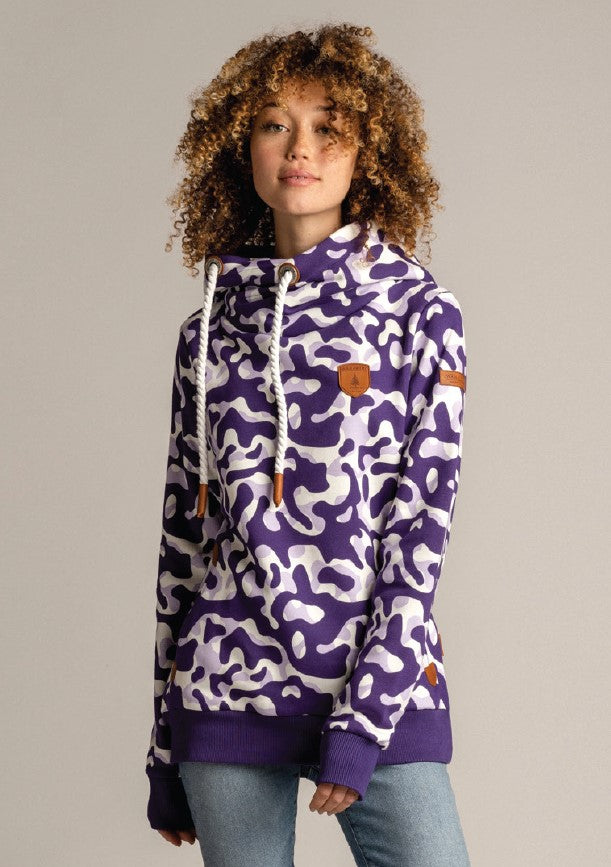 • Cowl neck hood with adjustable rope drawstrings and vegan leather caps