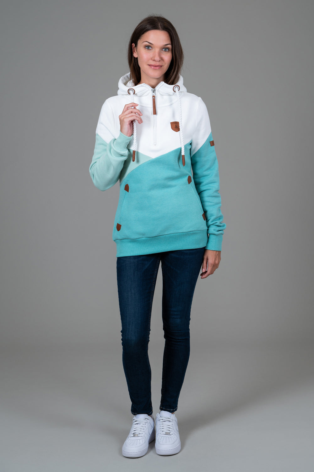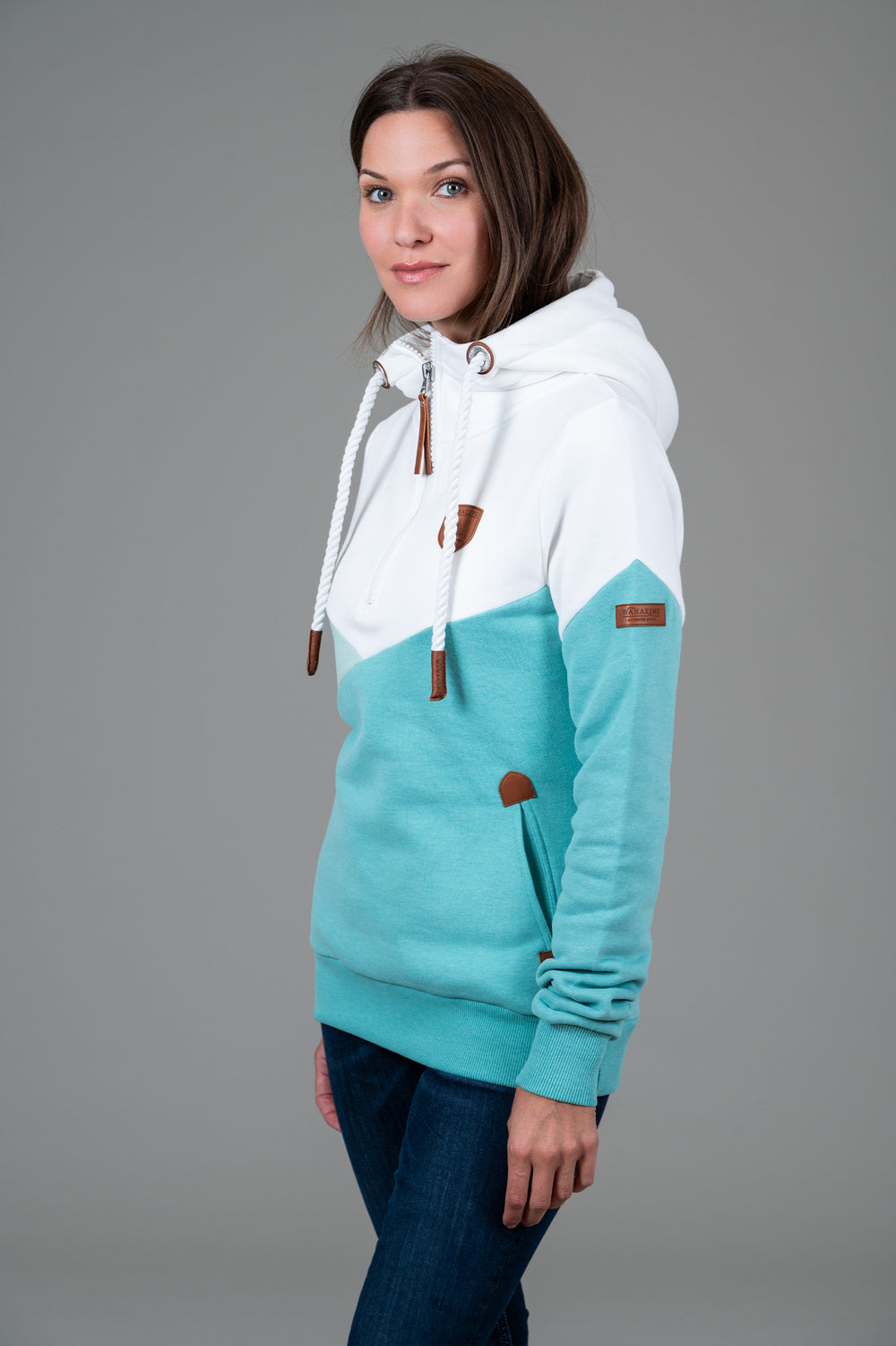 • High neck hood with adjustable rope drawstrings and vegan leather caps