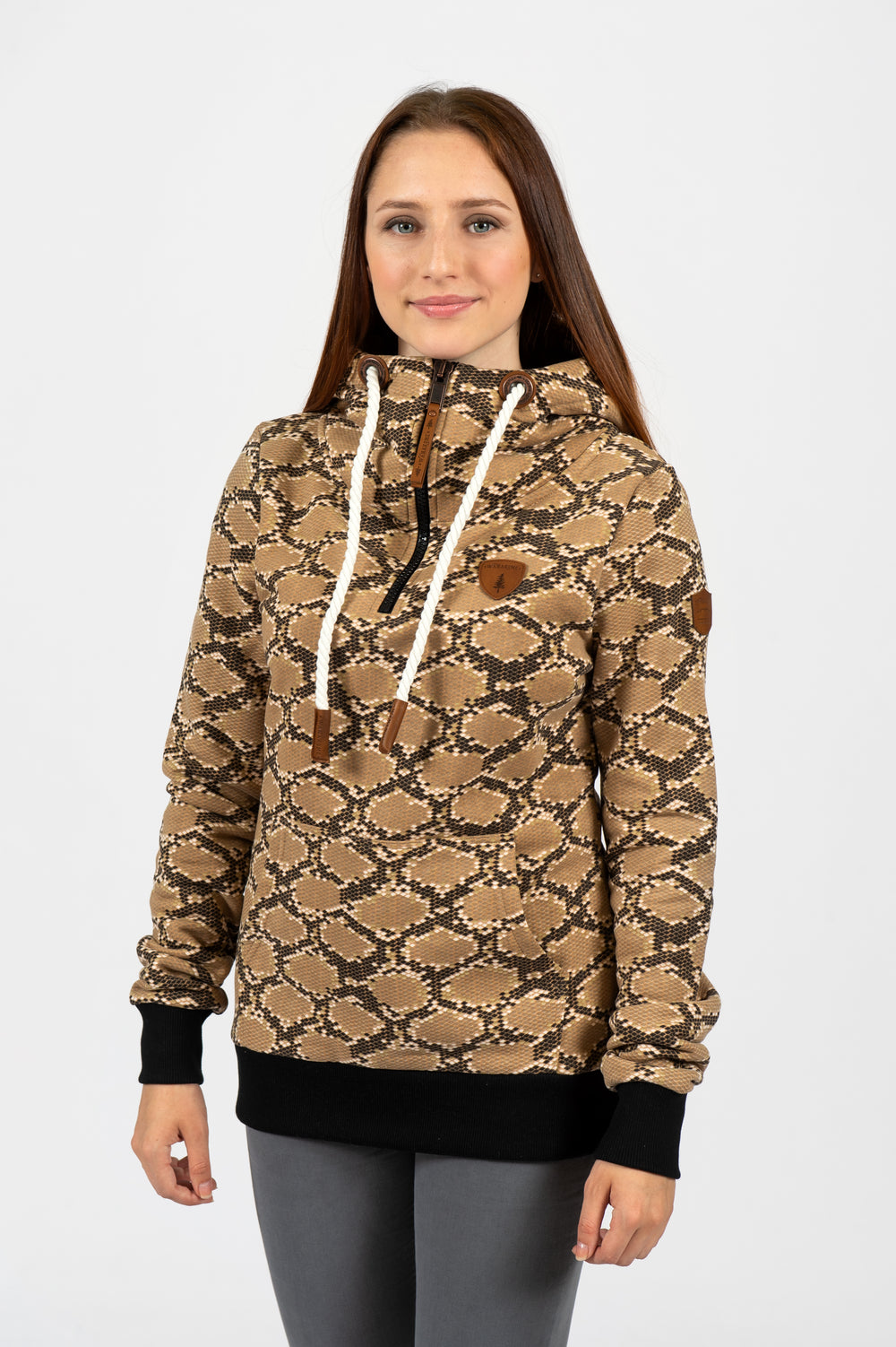Women's Terry Half Zip Pullover Hoodie in Neutral/Black Snake Pattern